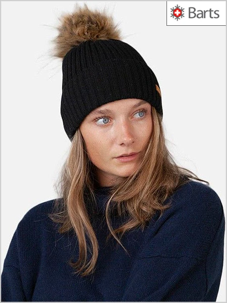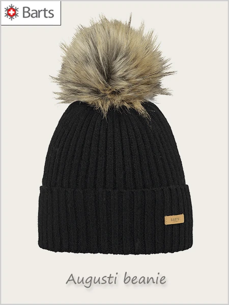 The Barts Augusti Beanie in Black. The Augusti Beanie is made of a wool blend. This beanie has a turn-up and a faux fur pom and is lined with a fleece headband for extra comfort.